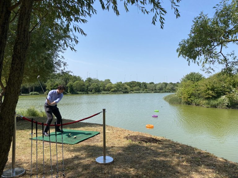 Pitch and putt into the lake, but only using fish friendly balls please.