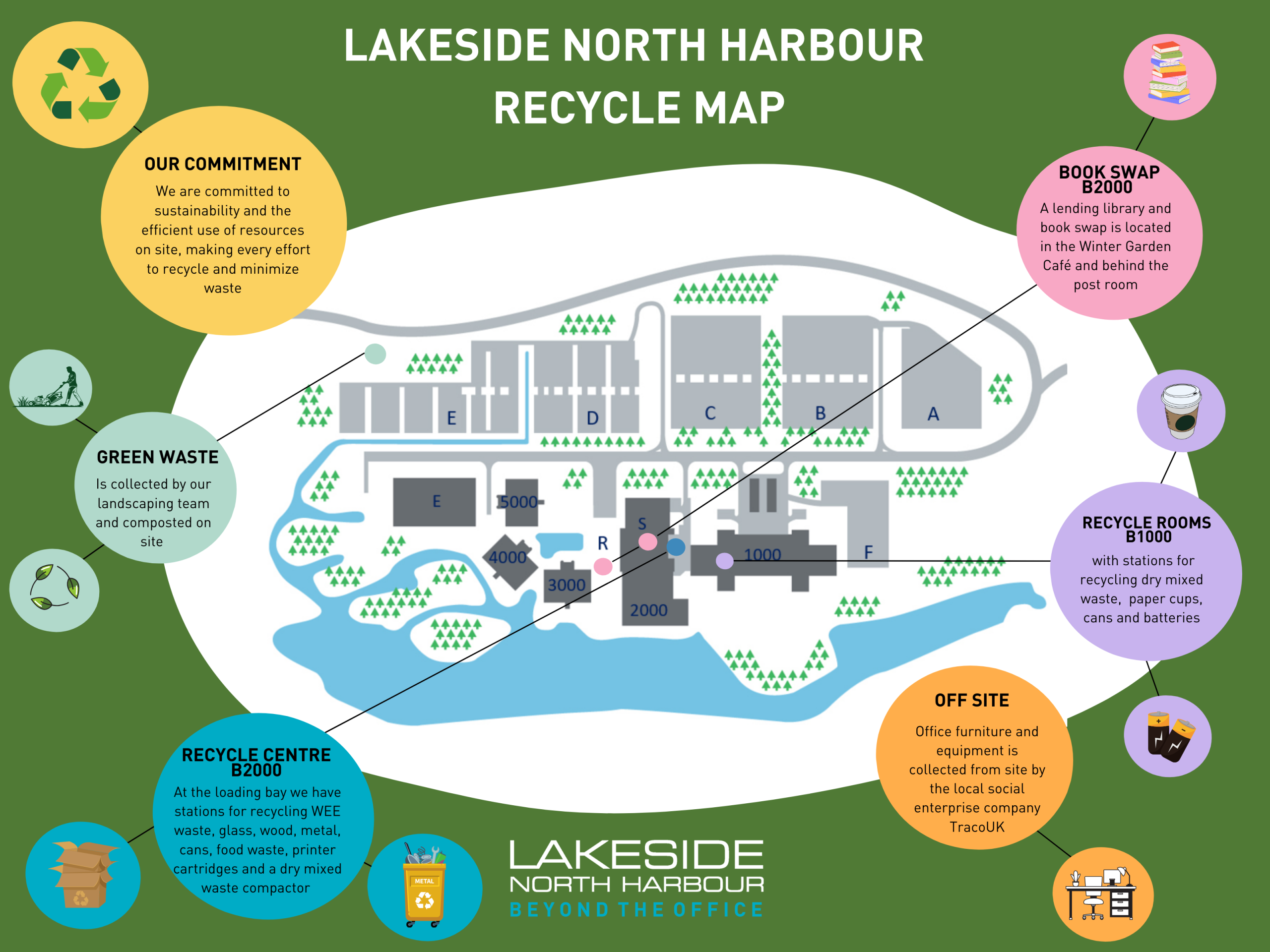 Our recycling infrastructure across the campus is designed to make it easy for occupiers to contribute to a greener future. We encourage everyone to make use of our facilities to recycle where possible – here’s a list of where to do this on site;